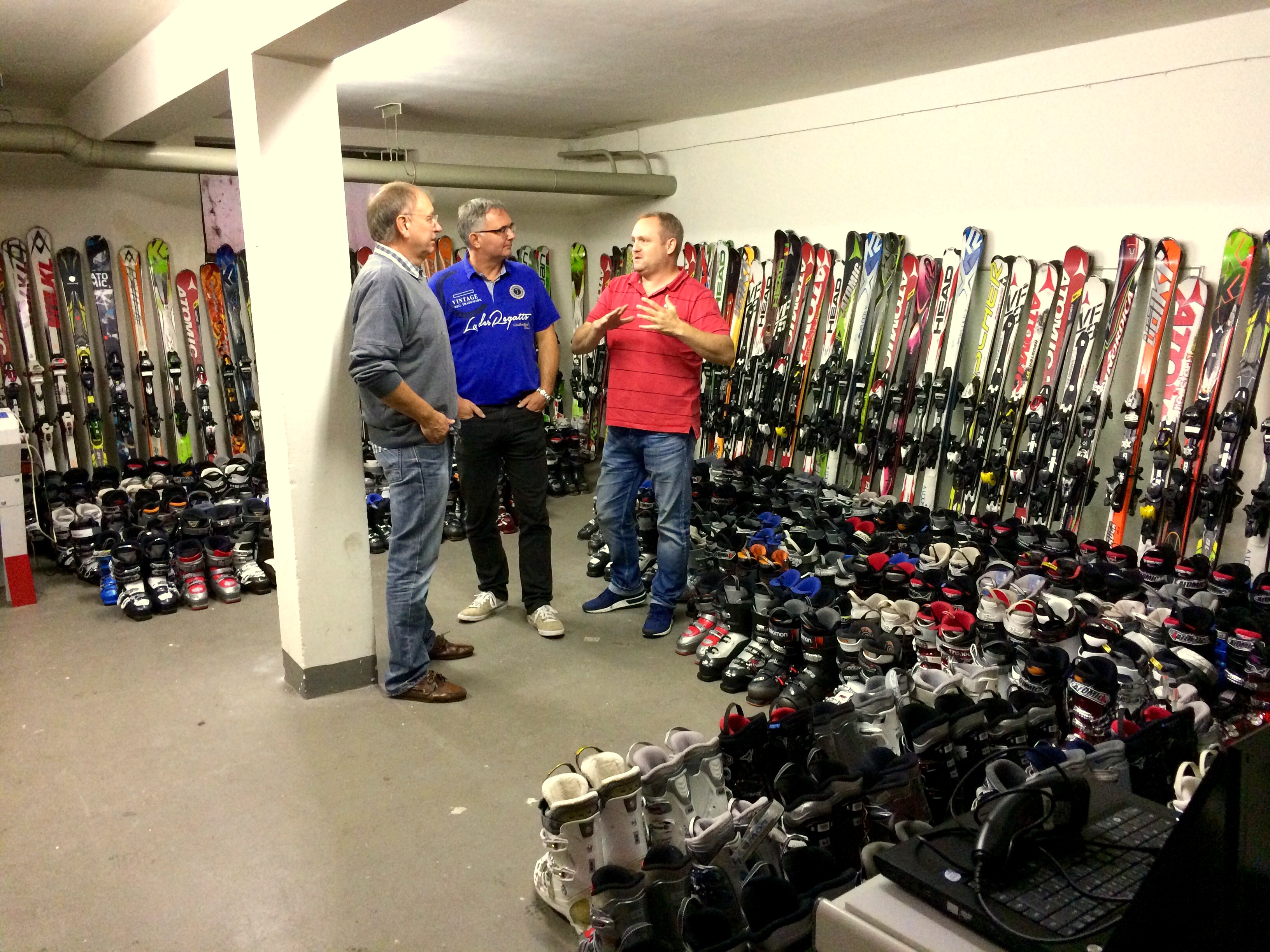 Friedrich (li) + Jürgen lassen sich vom SnowHow Chef Dirk Iserlohe (re) die Vorzüge der neuen Ski (u. a. Chip im Ski) erklären!
